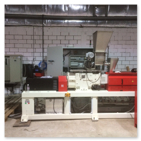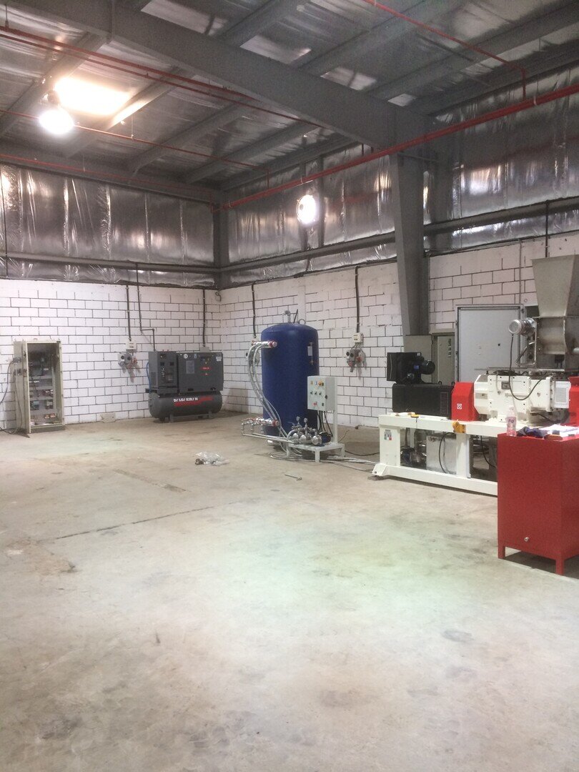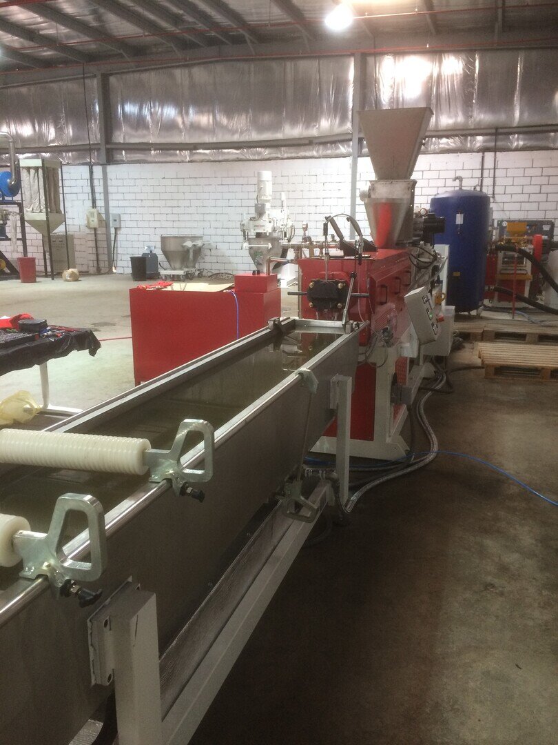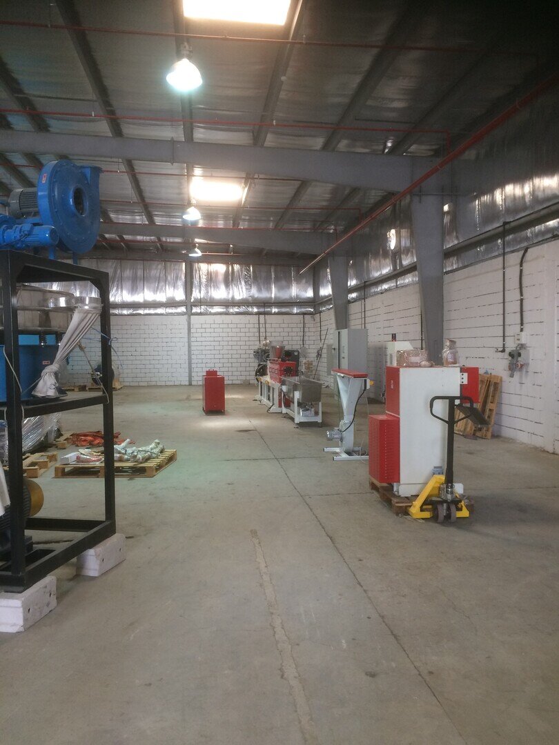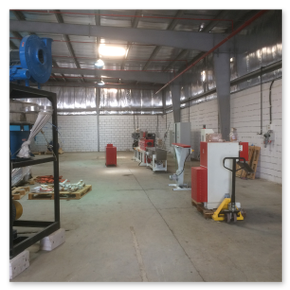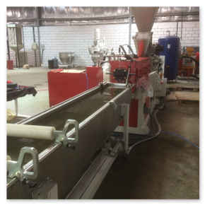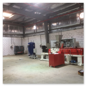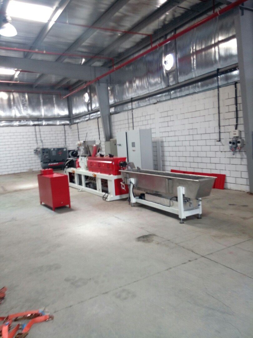 Installation de masterbatch avec extrudeuse RV50X42D complète avec cuve de refroidissement à effet lac, lame d'air, cutter LR15, tamis vibrant et mélangeur vertical. De plus, le système a été intégré à un réservoir de récupération de l'eau de dégazage et au réservoir de refroidissement du monofilament. Le système clé en main a ensuite été complété par un turbo-mélangeur, une unité de réfrigération et une unité de pompage pour la distribution d'eau froide. En plus de l'usine de production, un laboratoire de contrôle qualité complet a été doté de divers équipements pour la formulation et leur contrôle, ainsi que d'une presse pour tester les échantillons et d'une calandre pour la préparation des échantillons de mélange.