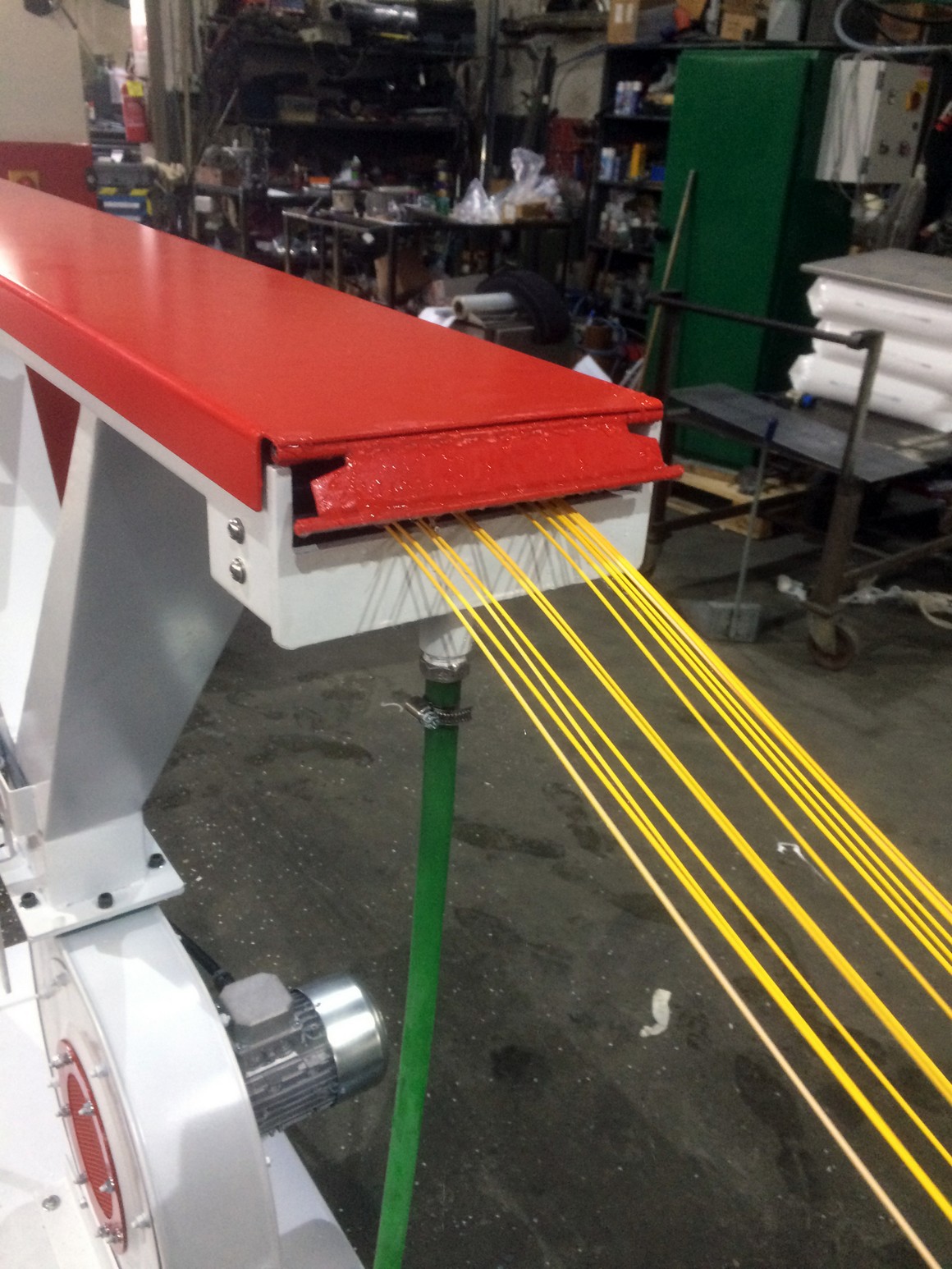 La torre di aspirazione dell’acqua tensionale dei monofili è una attrezzatura innovativa e speciale che sostituisce, per alcune applicazioni, la tradizionale lama d’aria. Si tratta di una torre che con particolari dispostiti di raschiamento e guida filo riesce a rimuovere l’acqua di tensione rimasta sul monofilo.